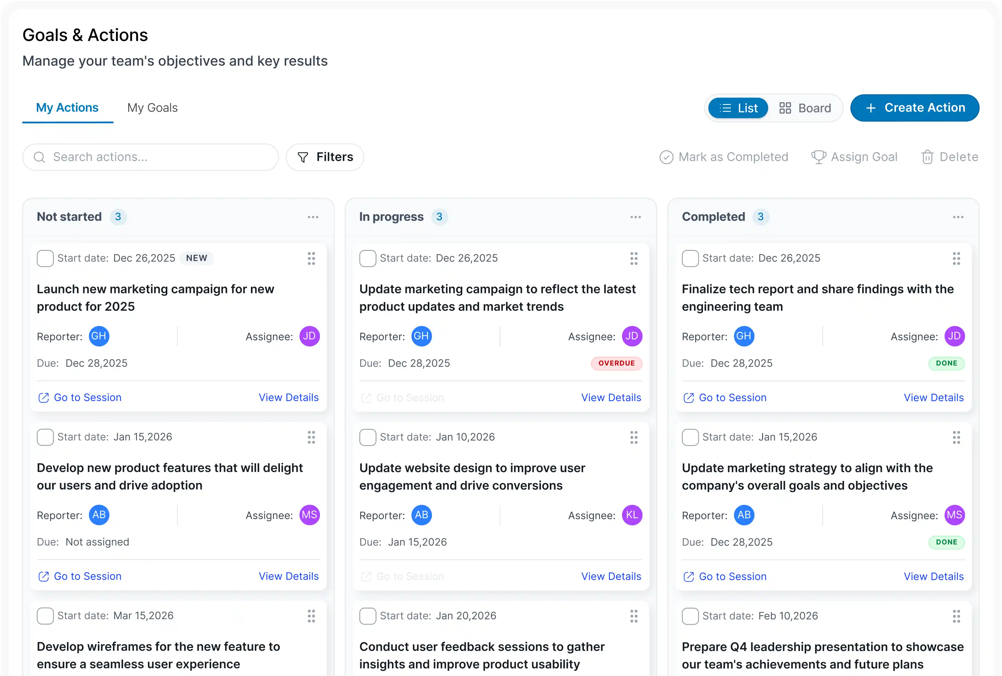 One-page strategic summaries. Track goals, actions, wins, and progress in a single view.