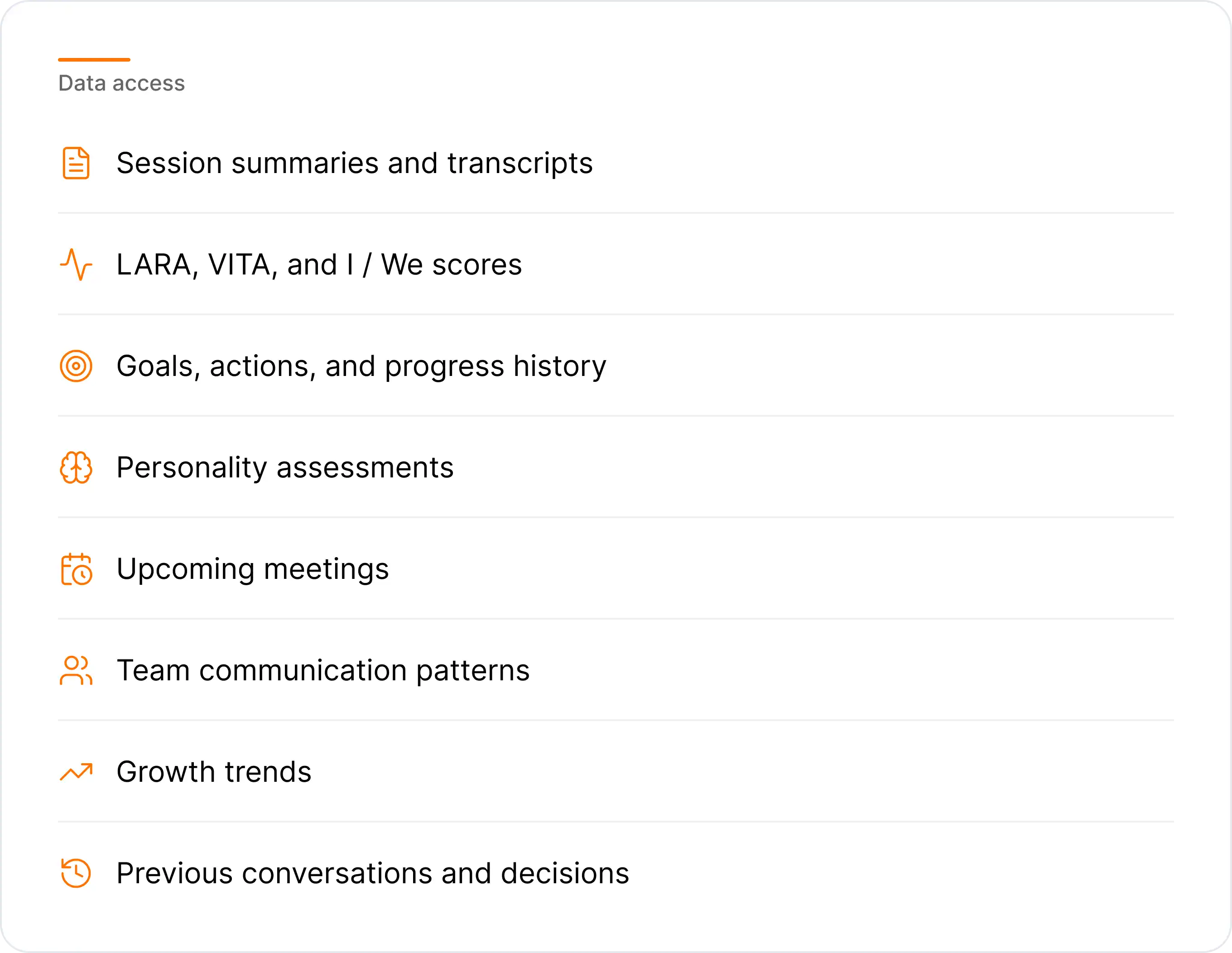 Most coaching tools start from scratch every conversation. The Virtual Coach is different — it draws on the full picture of your leadership data to deliver advice that's specific, timely, and relevant.
