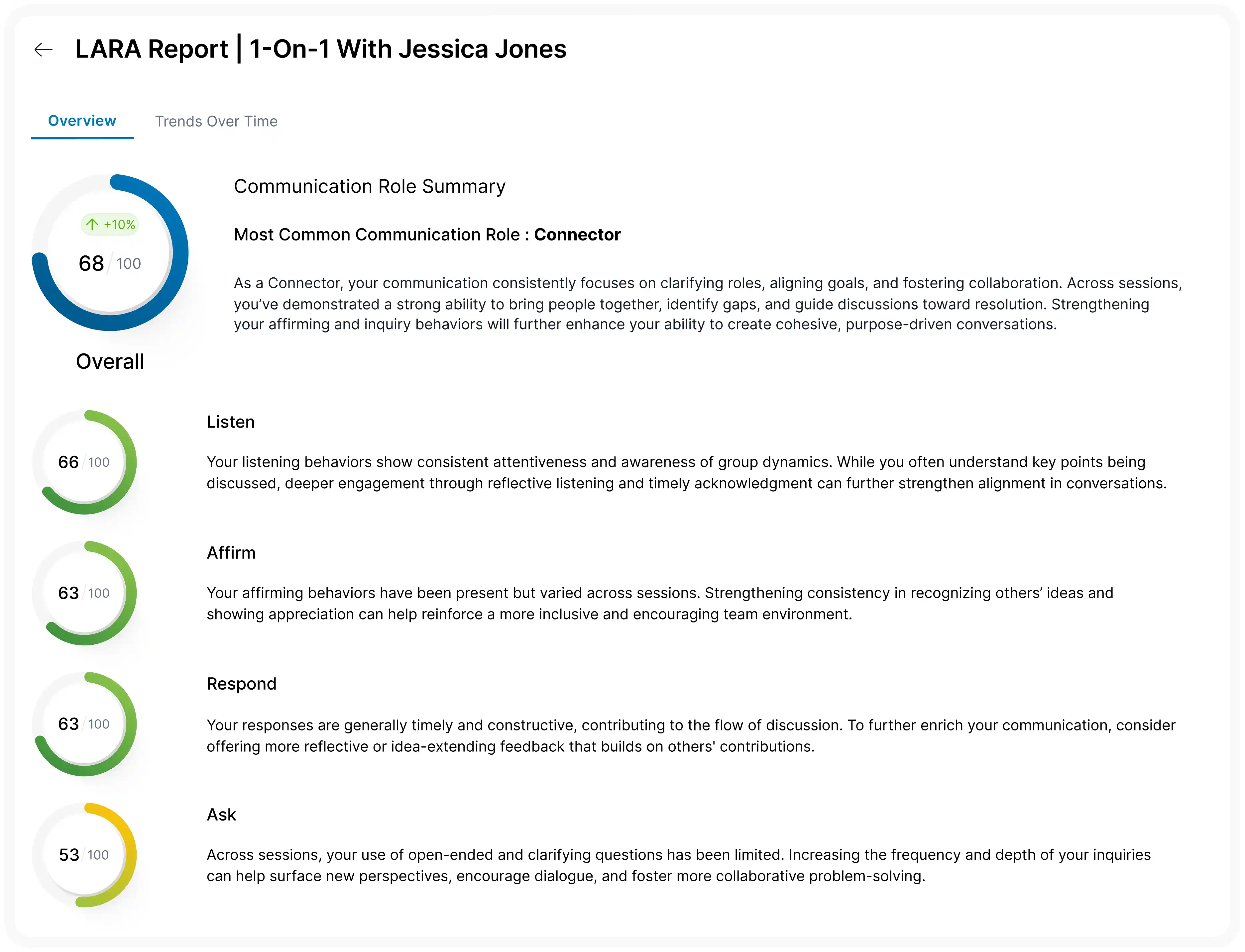 Get early signals of disengagement or churn. Catch drops in clarity, participation, or follow-through before they escalate.