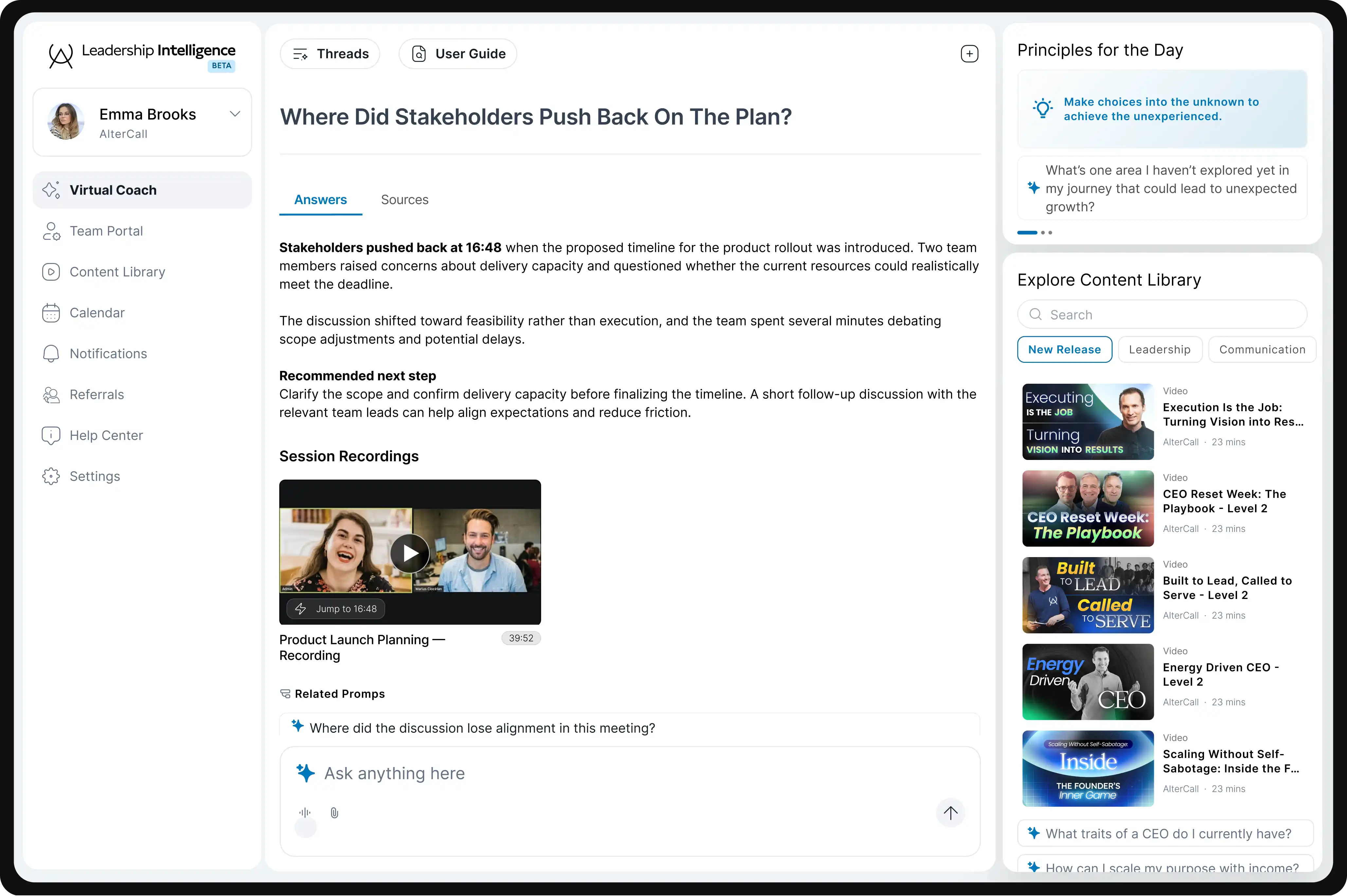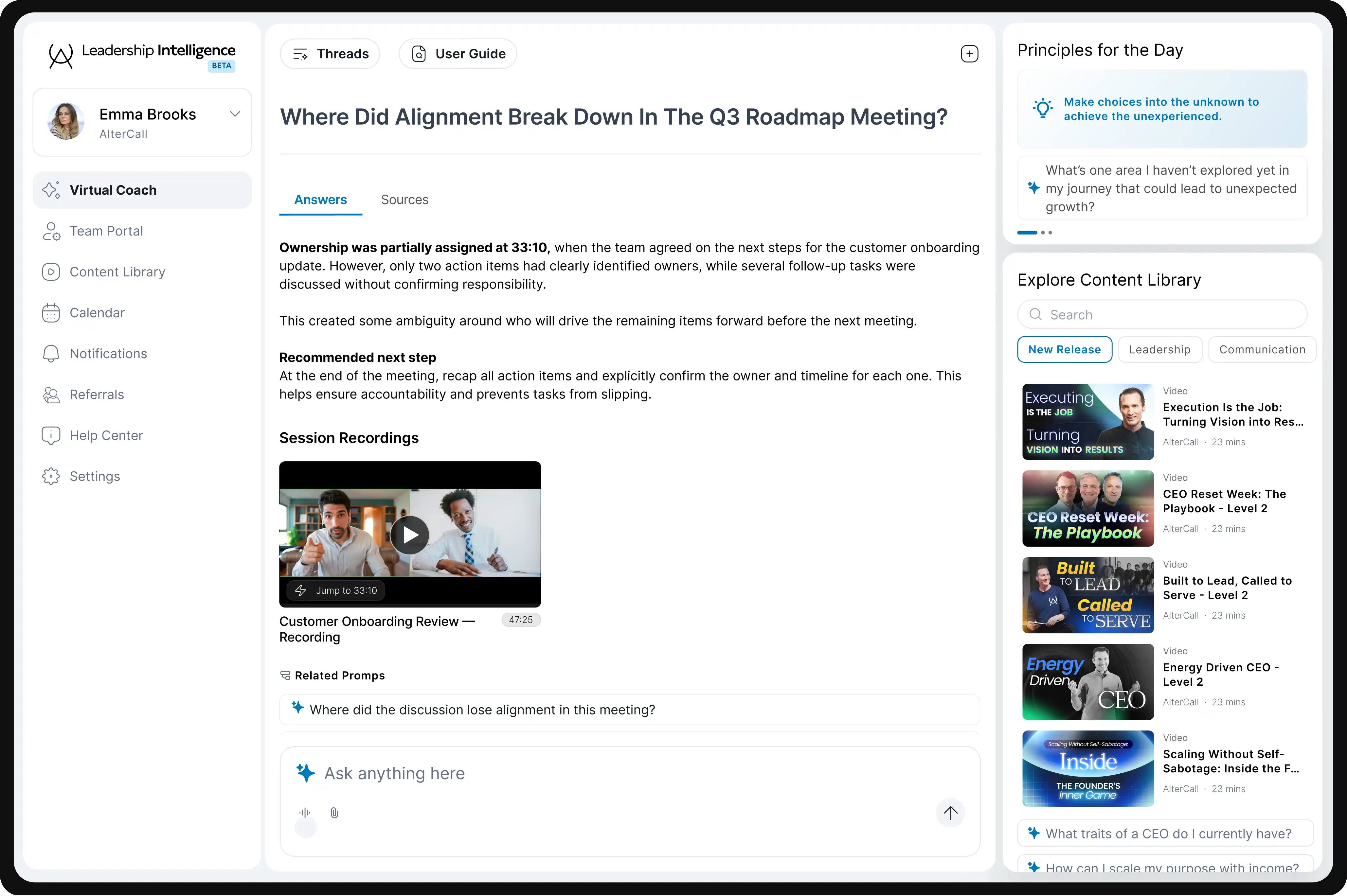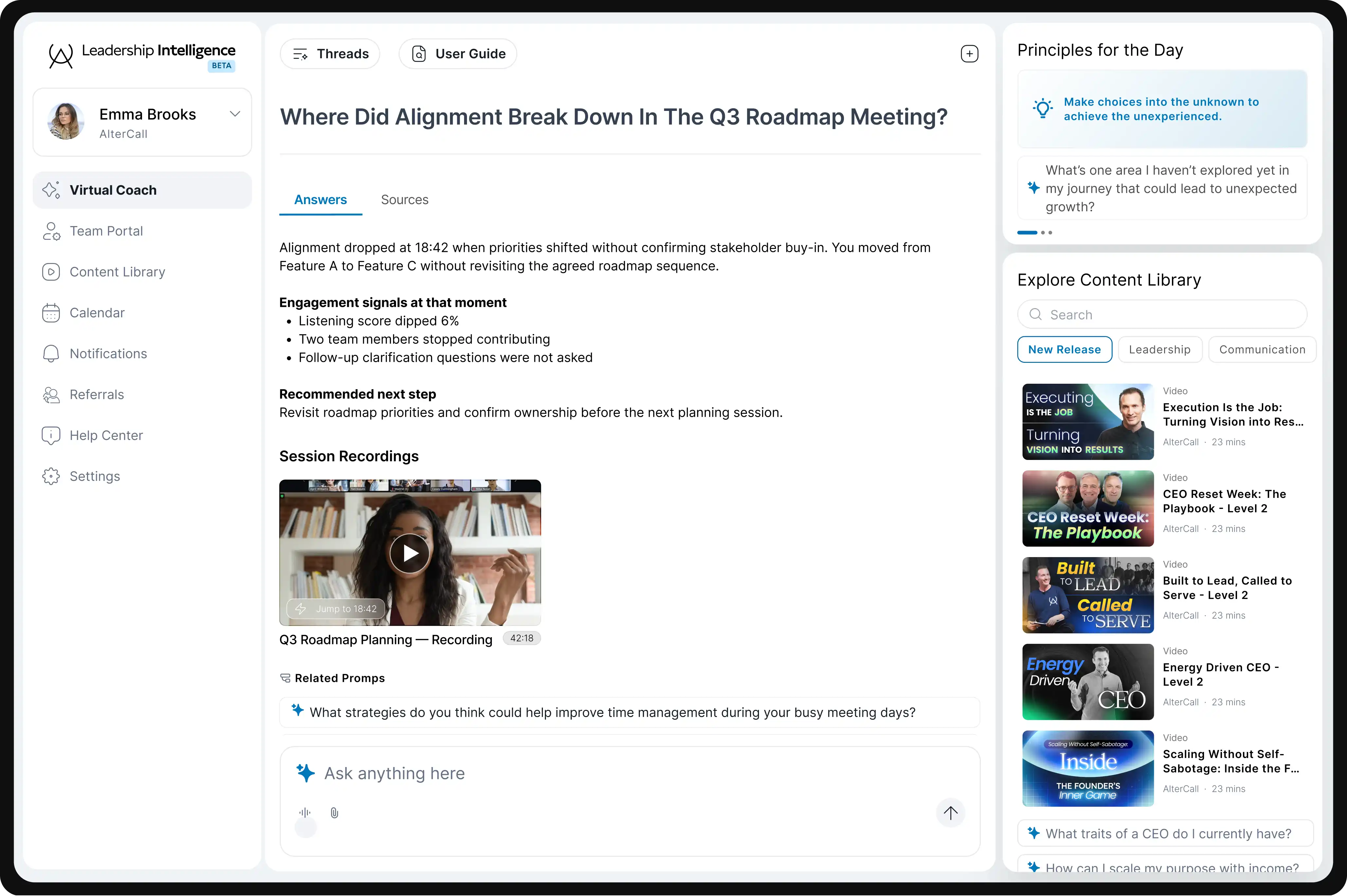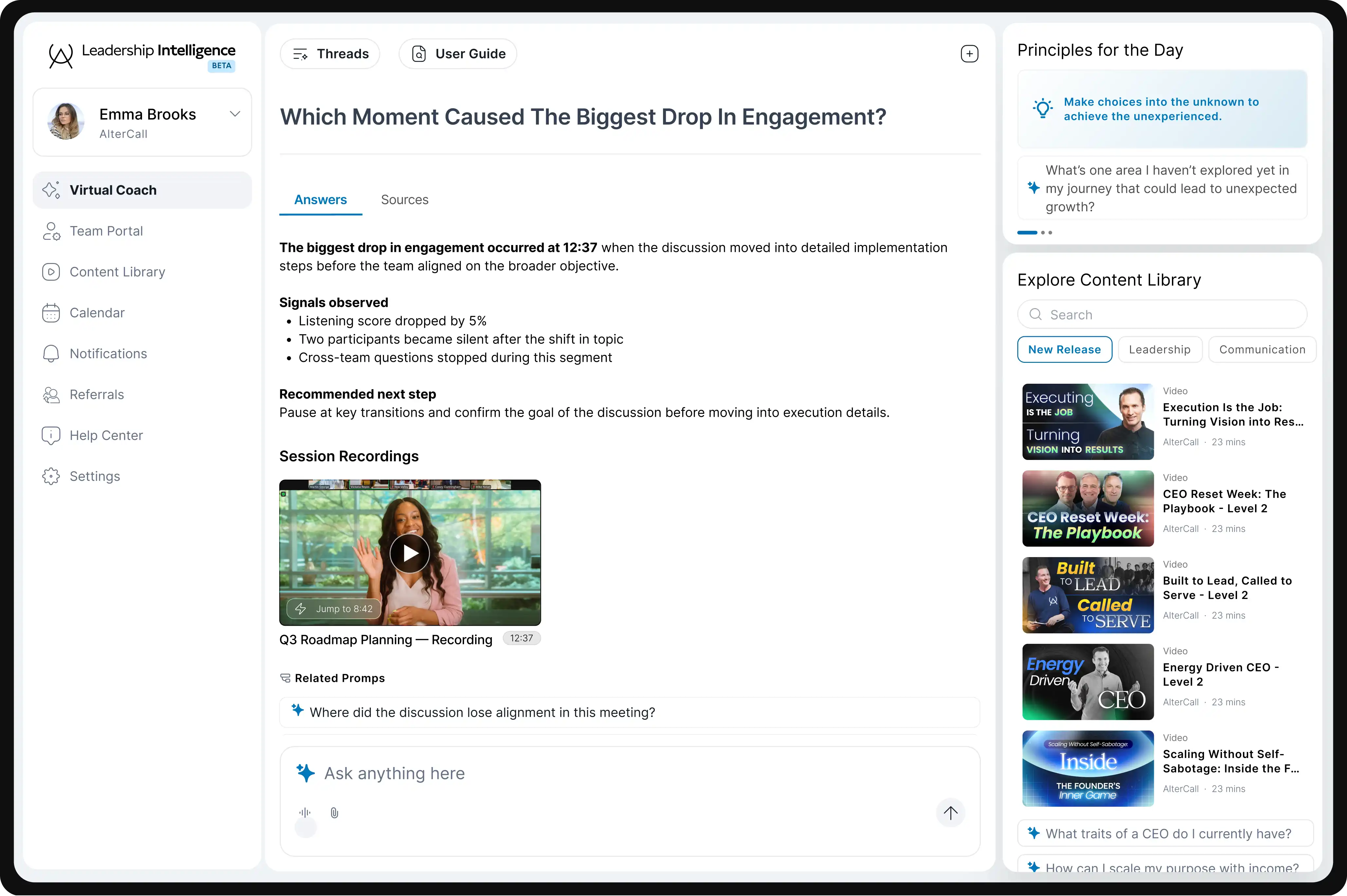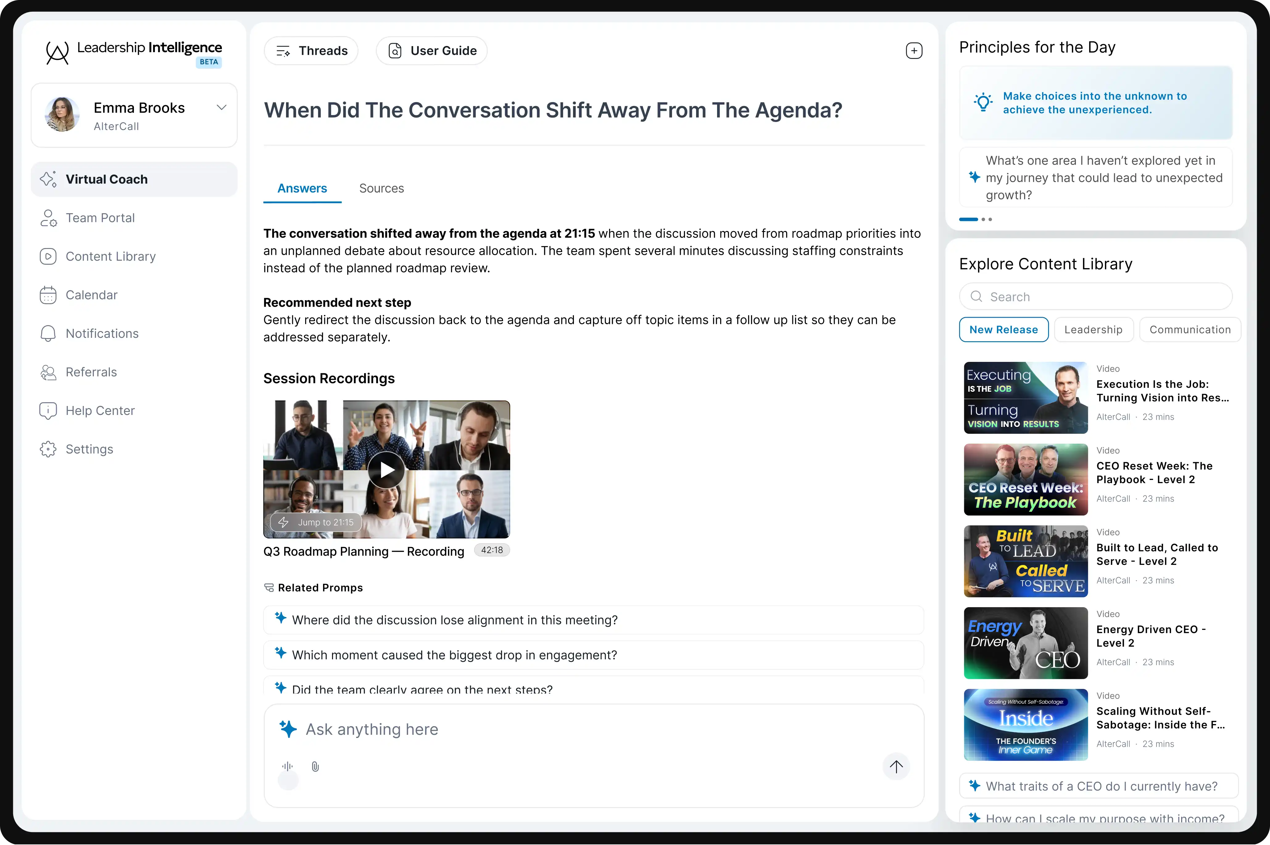 Launch instantly with AlterCall's curated lessons, prompts, and leadership frameworks.