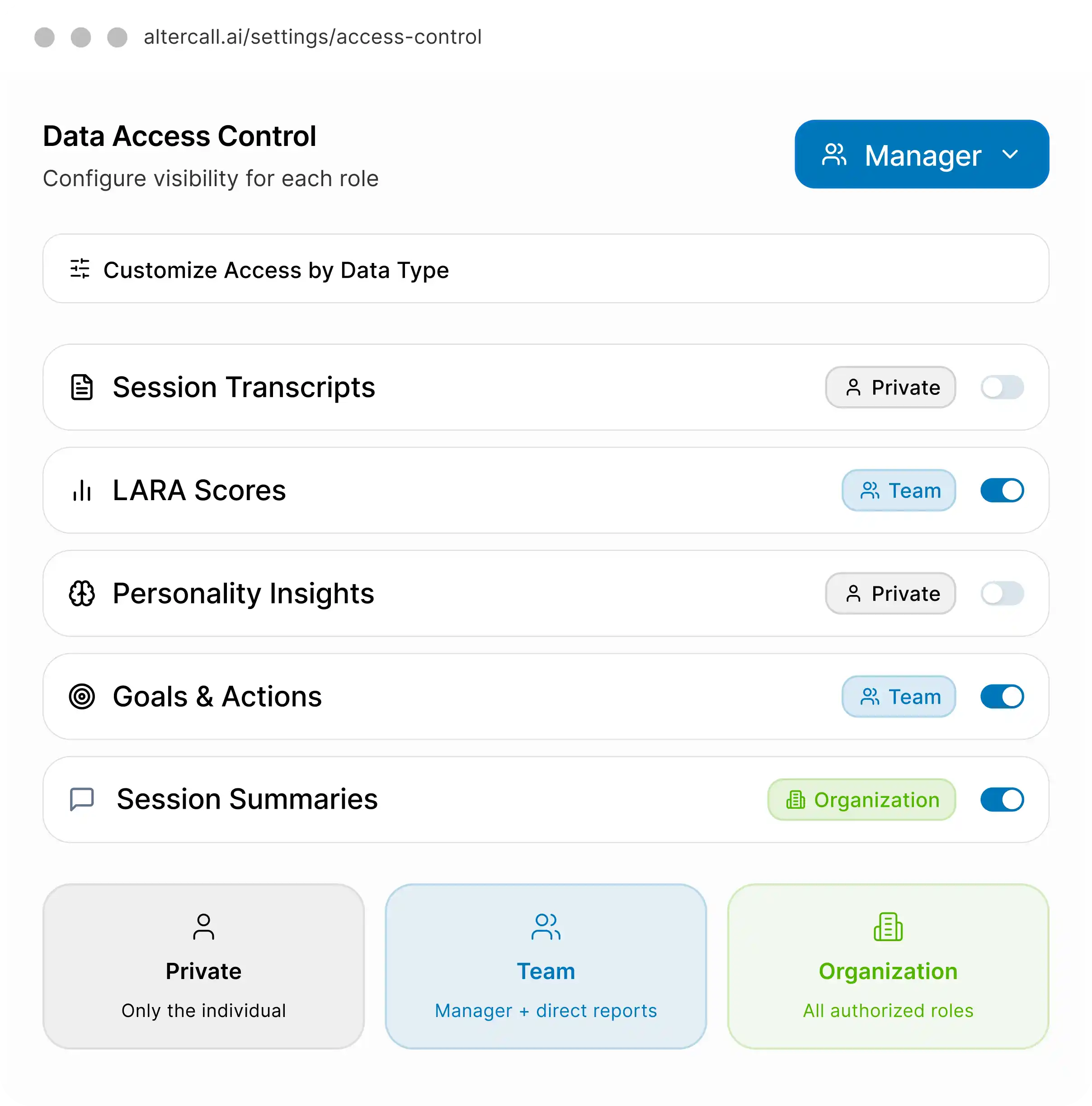 Give every role the right level of visibility. From individual contributors to senior leadership, customize access to LARA scores, transcripts, personality insights, goals, and actions — without compromising privacy.