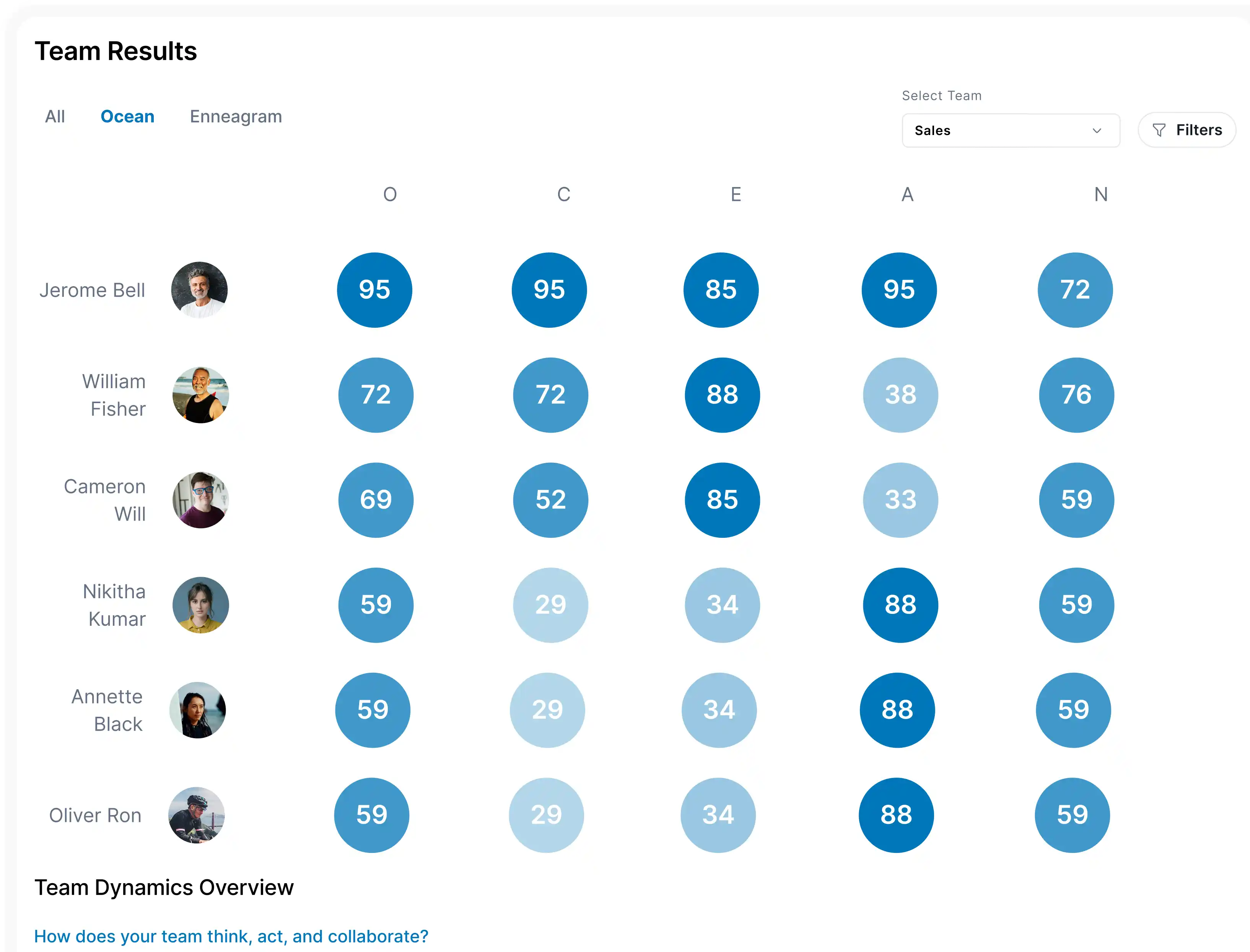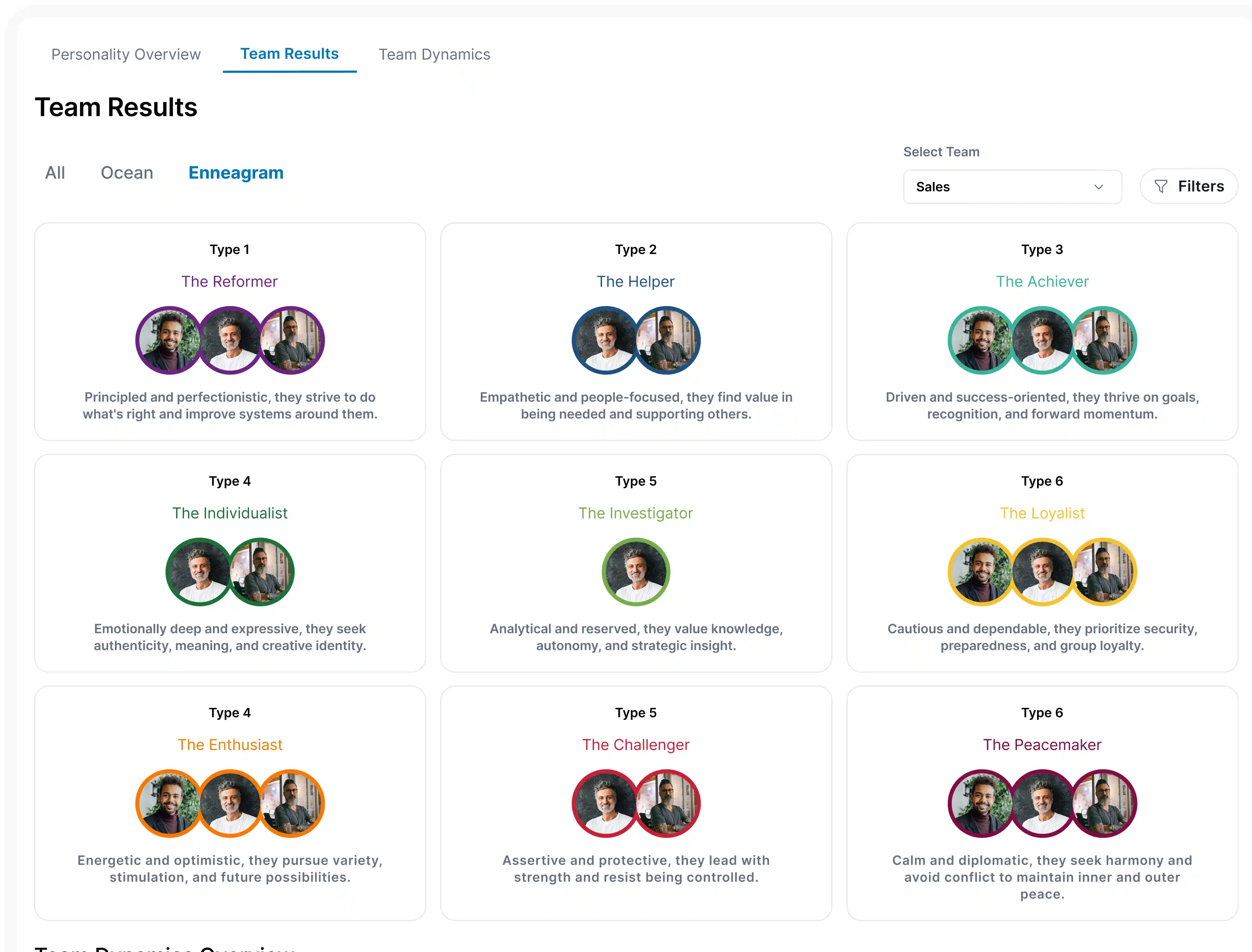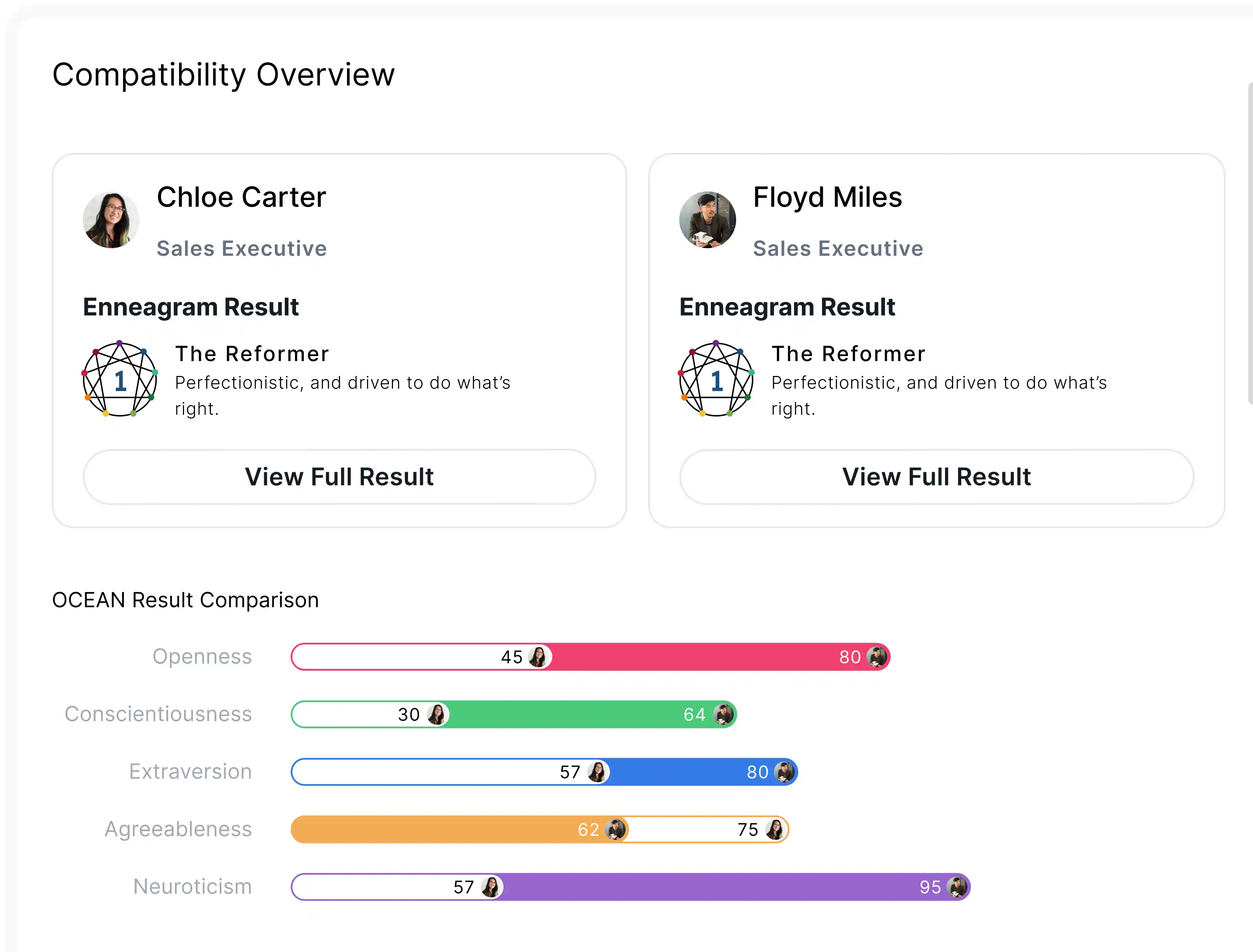 OCEAN + Enneagram overlays, blindspots, comparisons, compatibility.
