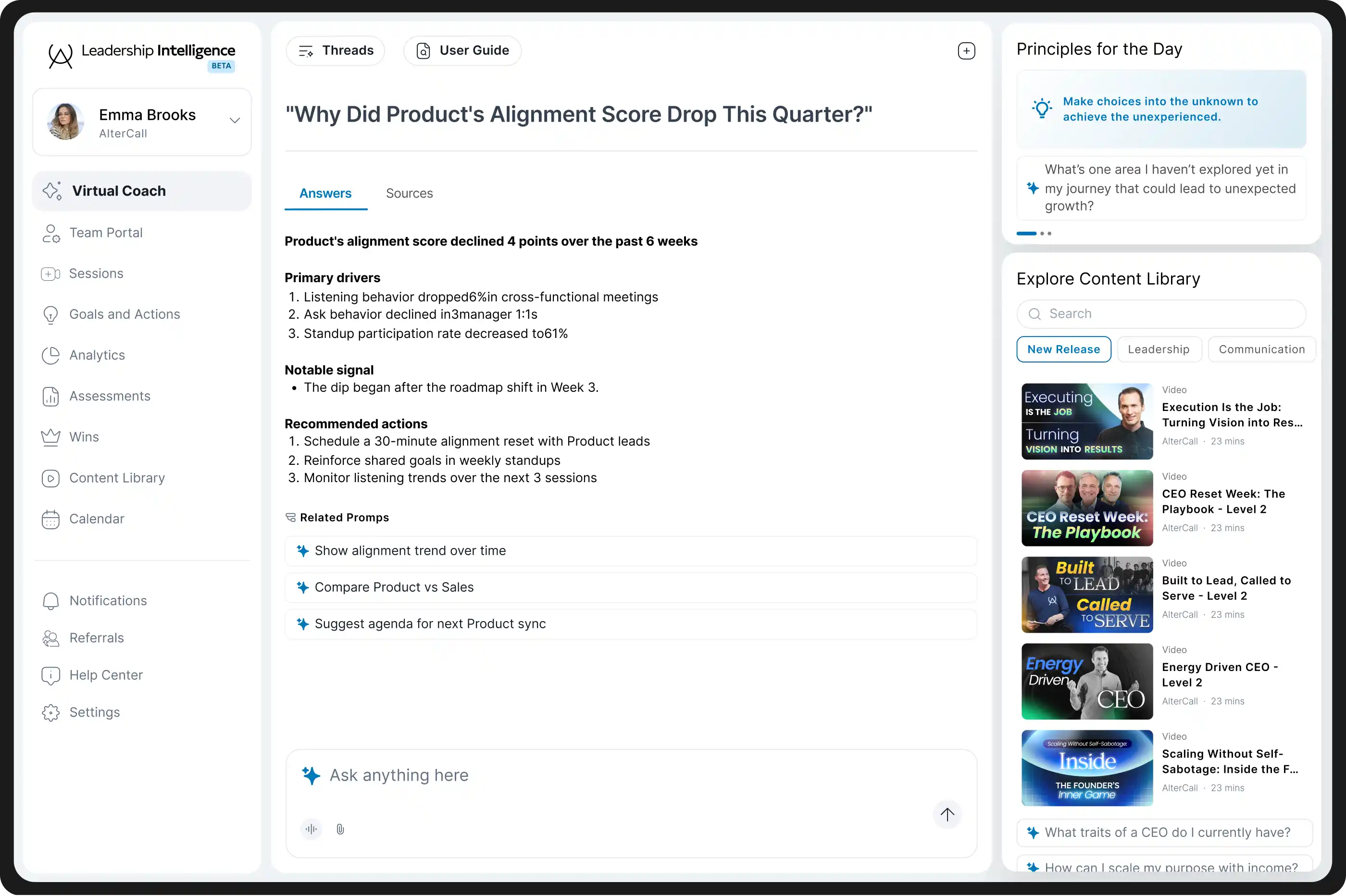 The Virtual Coach responds using real organizational data — grounded in sessions, scores, and assessments.